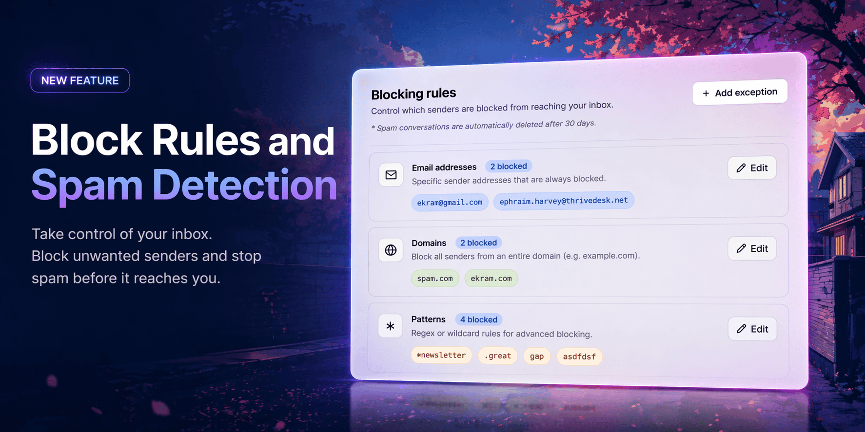 Email Addresses — Block specific senders by email. Any future messages from that address go straight to spam, never touching your active inbox.